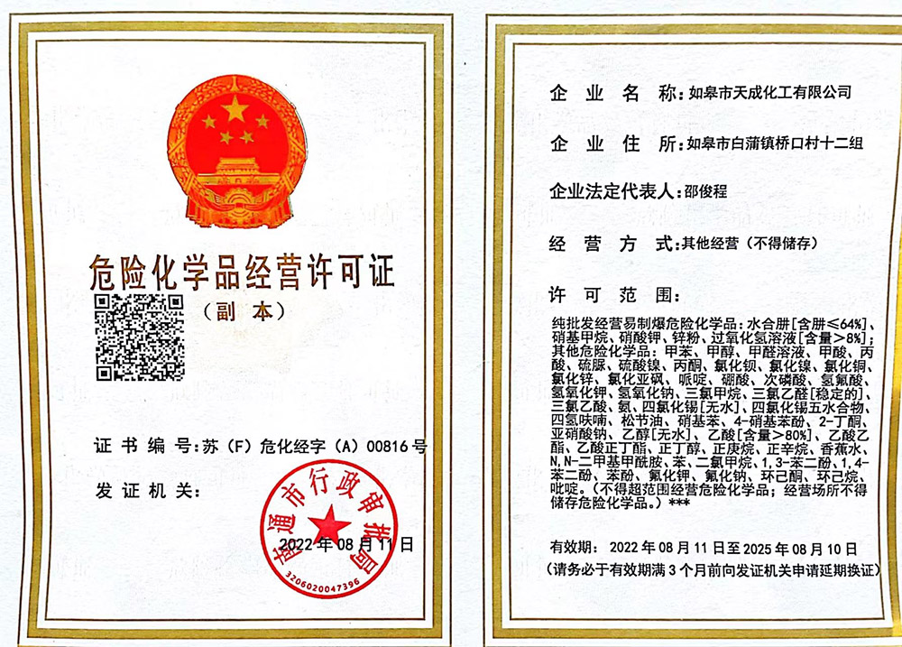 ? 如皋市天成化工有限公司創(chuàng)建于1996年。公司地處于美麗富饒的長江三角洲,座落在古鎮林梓,通揚運河河畔。南瀕長江、西臨204國道,距南通港、飛機場30公里,立體交通發(fā)達。公司經營管理規(guī)范,技術力量雄厚,擁有一批高、中級專業(yè)技術人才。